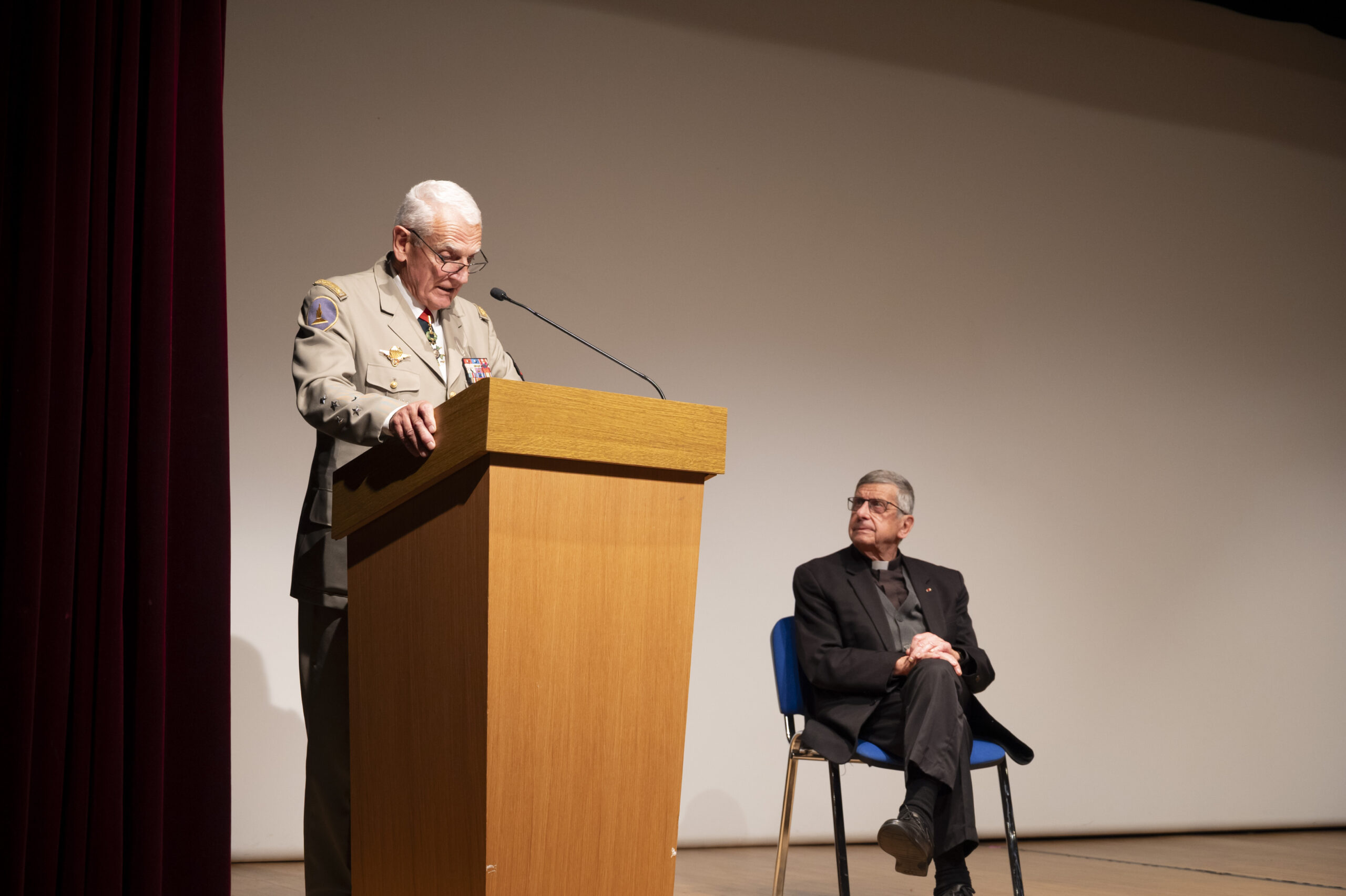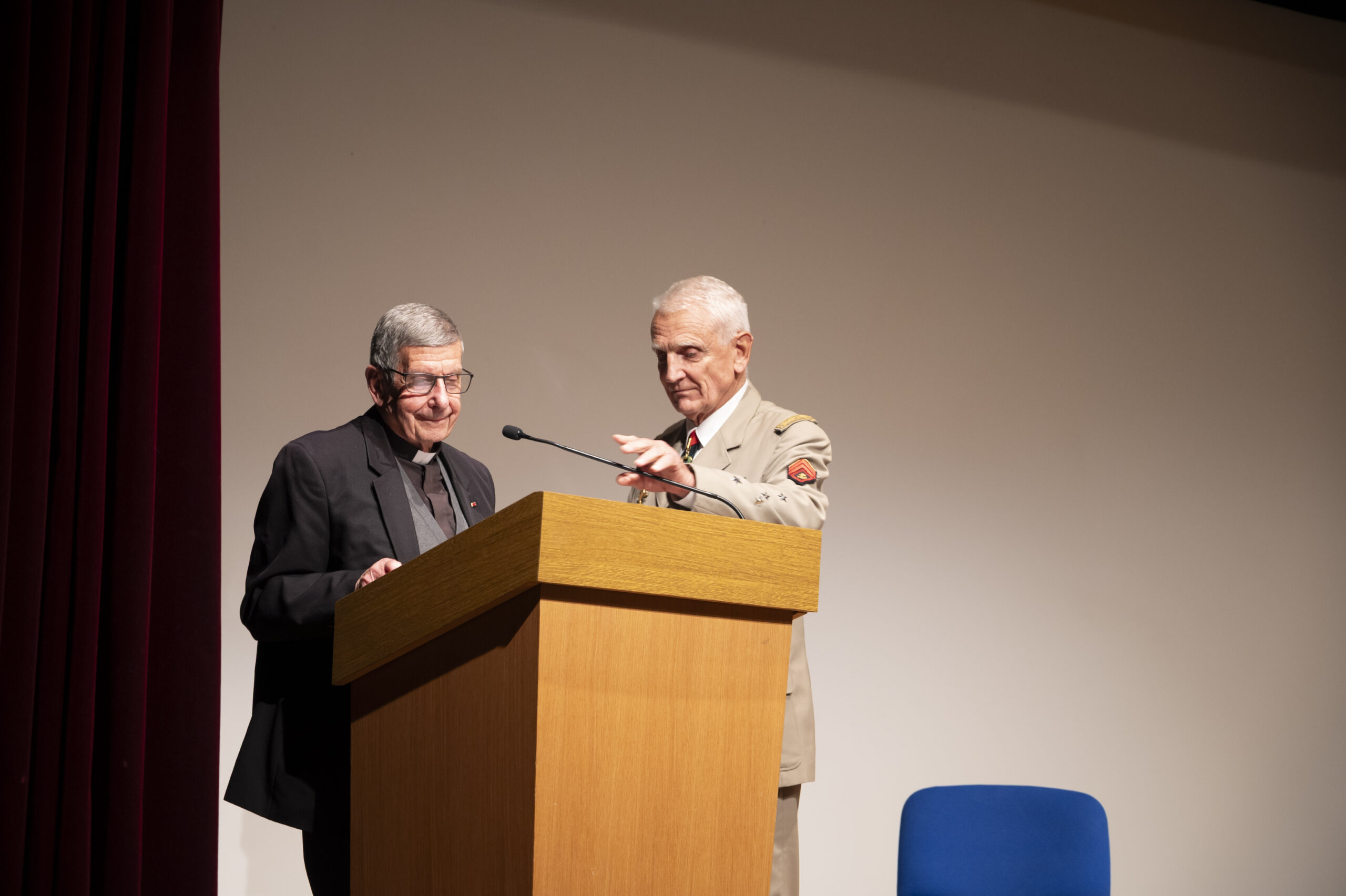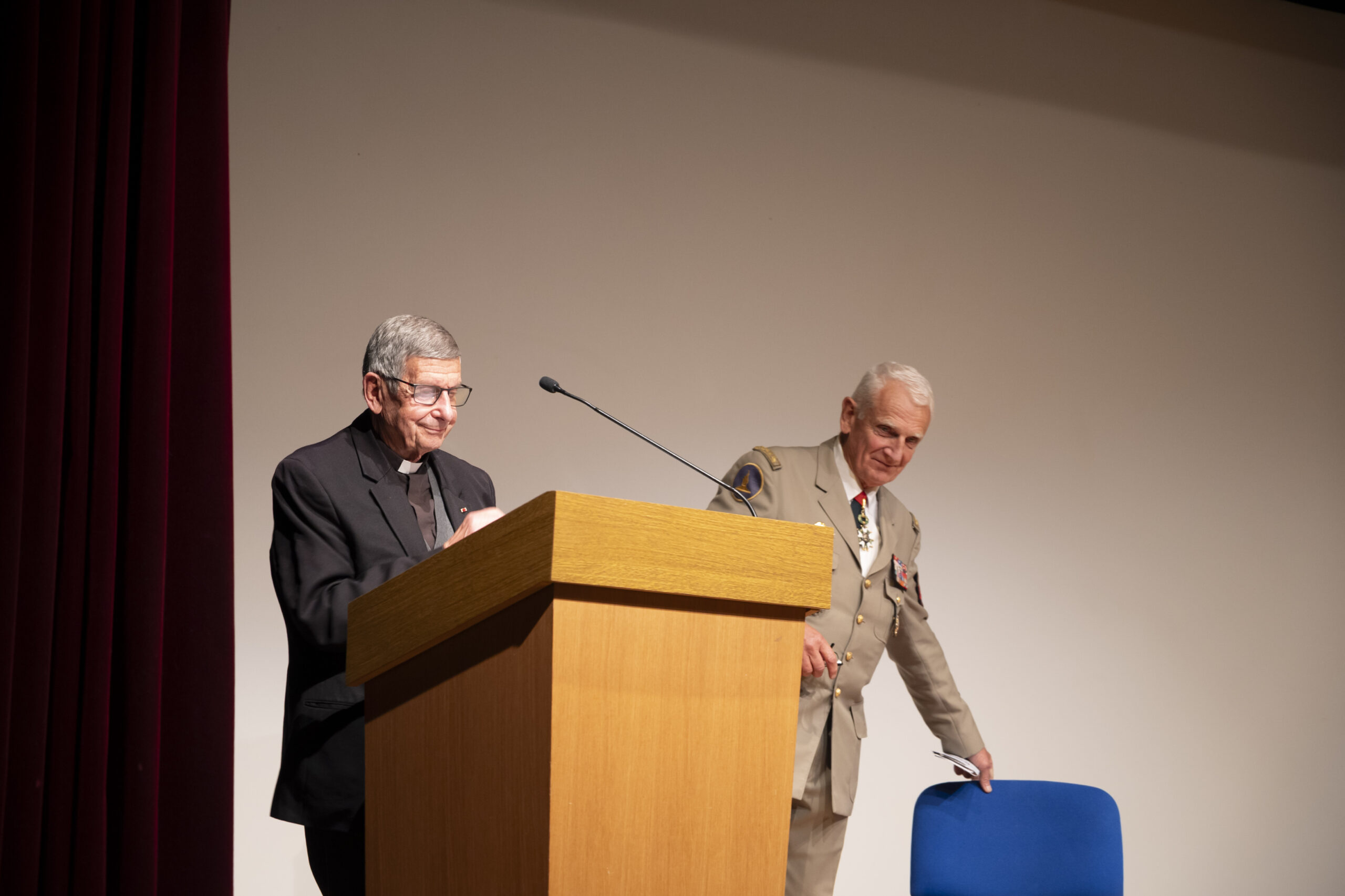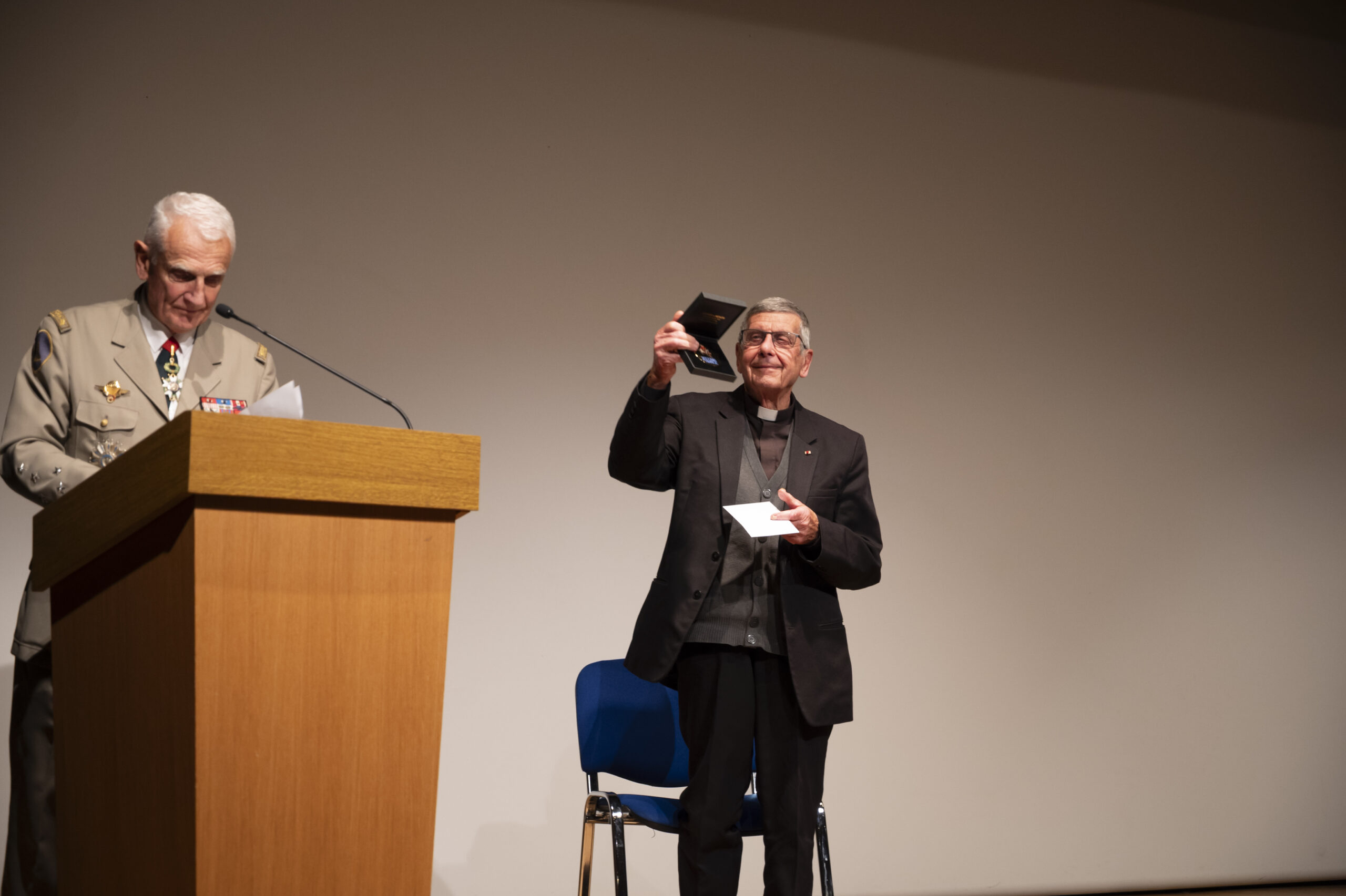 Et puis vint le temps des discours, notre président, Jean-Marie Schmitz, Le général Bruno Dary, ancien COMLE et bien sûr l’impétrant, le Père Yannick Lallemand :