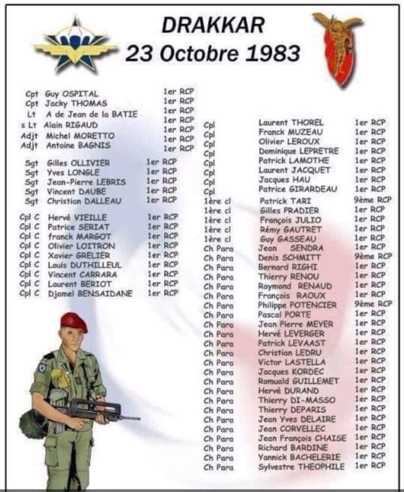 Nous n’oublions nos 58 camarades en ces temps où le Liban, ce pays ami dont la France assurait la protection, et qui se trouve à nouveau souis la tempête dans ce Moyen-Orient compliqué.