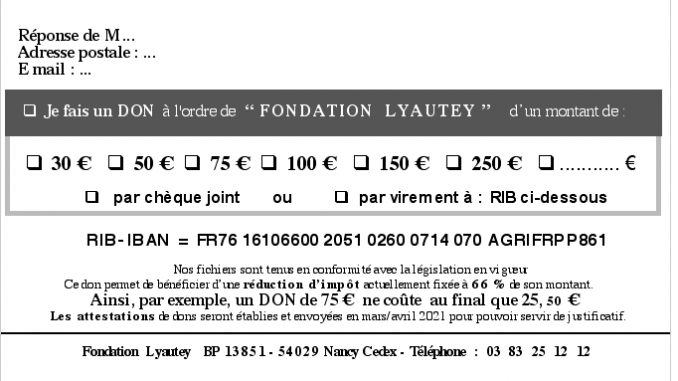 Actualités, Notre pays Un appel de la Fondation Lyautey Posté le 4 août 2020 par De quoi s’agit-il ? = suivre ce lien Qu’est-ce que la Fondation ? = suivre ce lien Bon de soutien à enregistrer et imprimer : Partager :